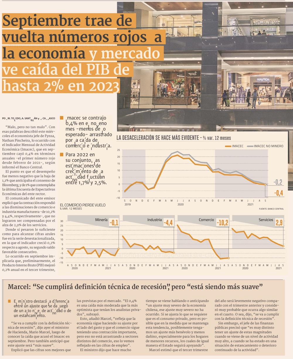Economía cae menos de lo esperado en septiembre y Marcel abre debate entre los expertos sobre magnitud del ajuste de la actividad en 2023 - (Pulso)