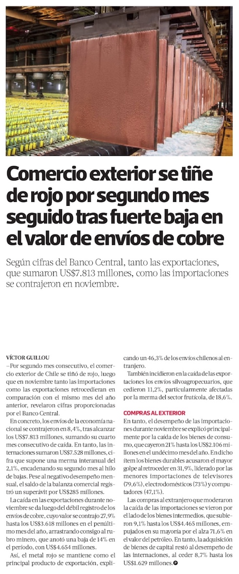En noviembre, exportaciones de bienes enfrentan su mayor caĆda en 33 meses - (El Mercurio de Santiago)