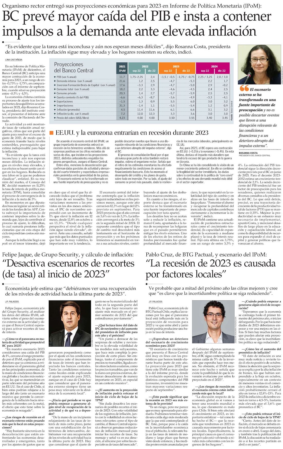 IPoM: Banco Central prevé mayor caída del PIB y de la inversión para 2023 y una inflación más alta - (Pulso)
