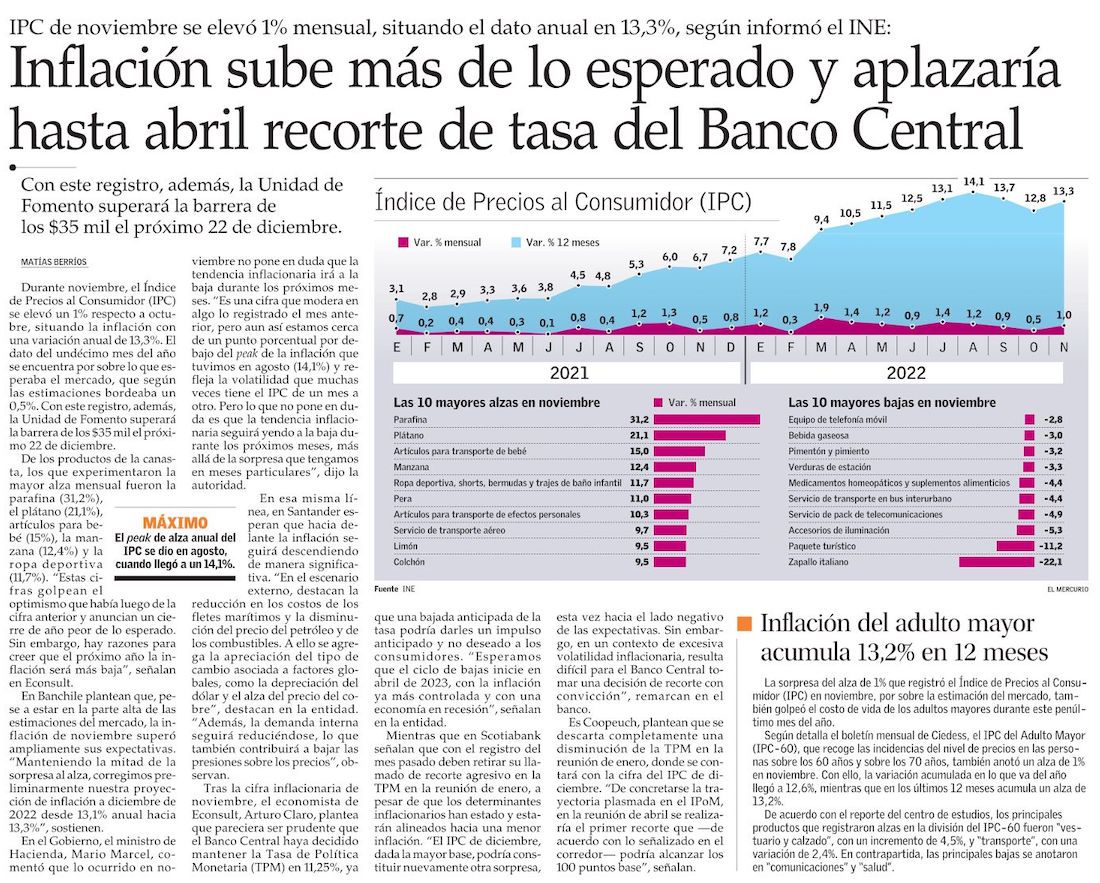 Tras IPC de noviembre inflación anual vuelve a superar la barrera del 13% y pone en jaque nueva proyección del BC - (Pulso)