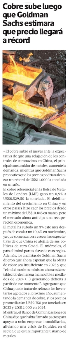Precio del cobre sube 2,44% y Goldman Sachs eleva estimación para 2023 y 2024 - (El Mercurio de Santiago)