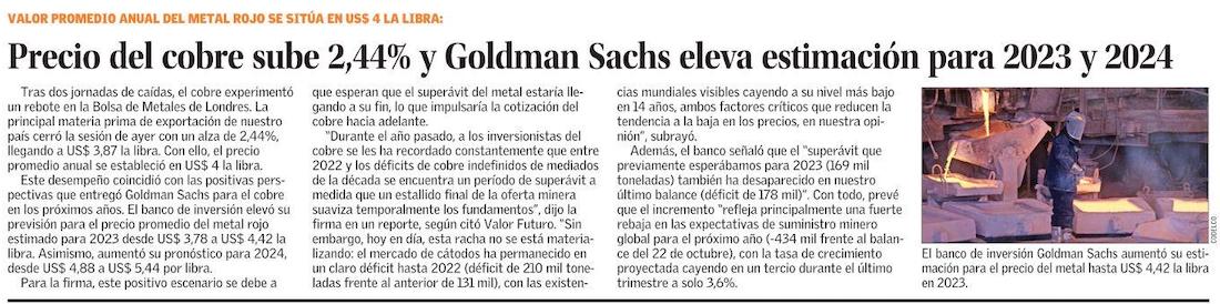 Cobre sube luego que Goldman Sachs estimara que precio llegará a récord - (Pulso)