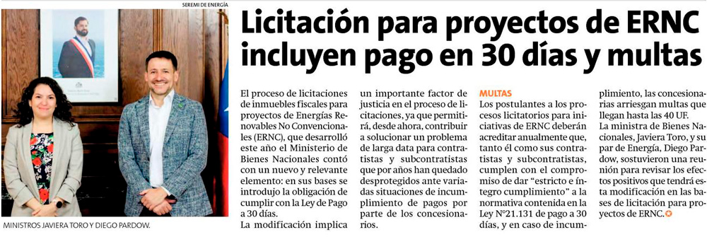 Proyectos de Energías Renovables No Convencionales deberán cumplir Ley de Pago a 30 días - (eldesconcierto)