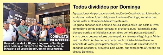 Pescadores de La Higuera piden a ministra Maisa Rojas inhabilitarse de votar Dominga - (El Mercurio de Santiago)