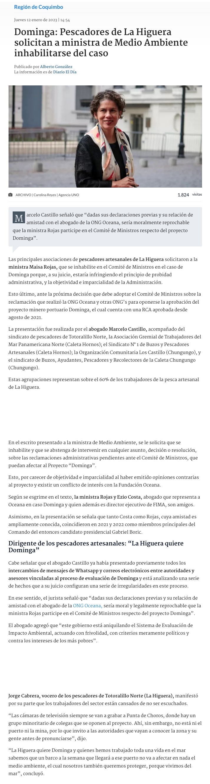 Pescadores de La Higuera piden a ministra Maisa Rojas inhabilitarse de votar Dominga - (El Mercurio de Santiago)