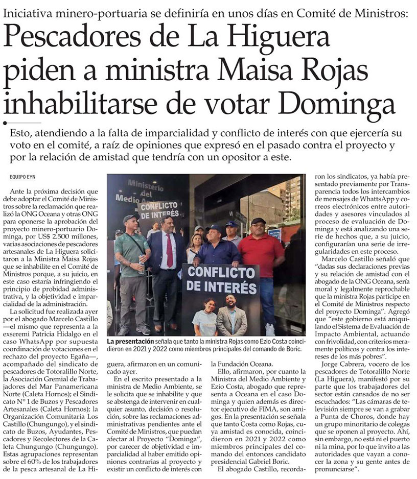 Dominga: Pescadores de La Higuera solicitan a ministra de Medio Ambiente inhabilitarse del caso - (biobiochile online)