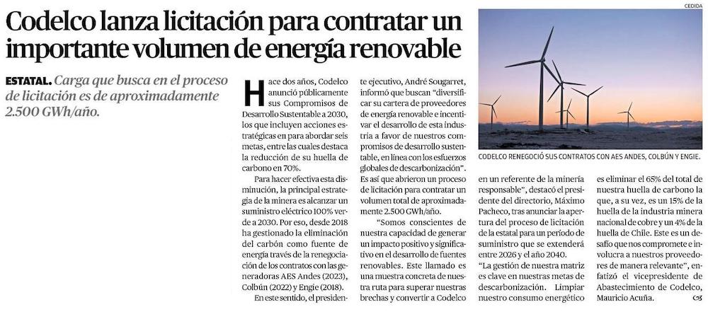 Codelco lanza licitación para contratar alto volumen de energía renovable e impulsar desarrollo de la industria - (emol)
