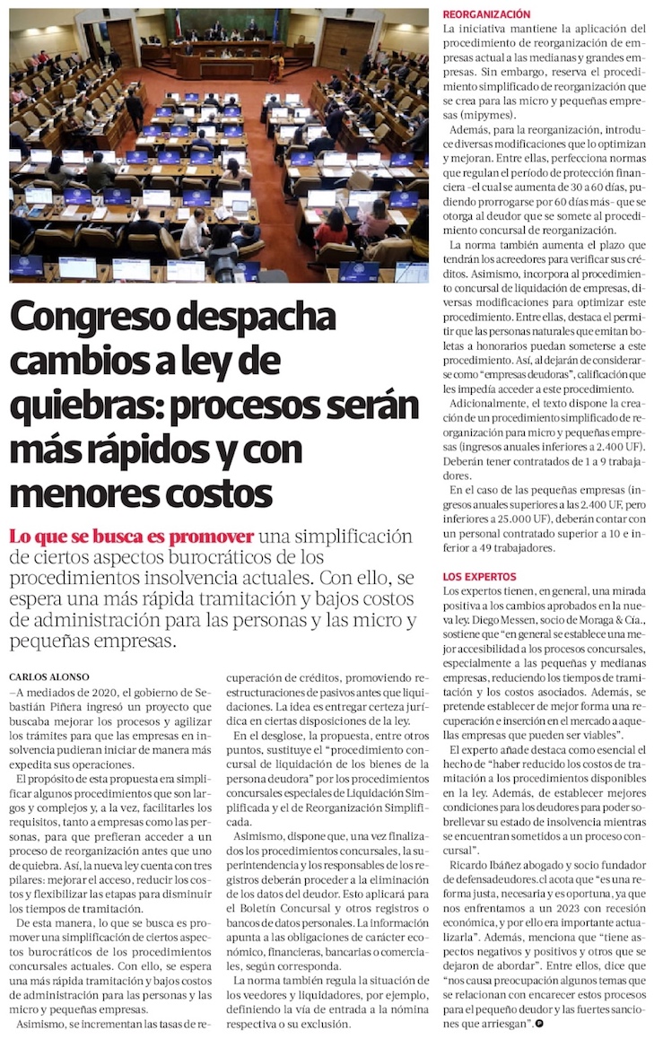 Cambios en la ley de quiebras buscan incentivar la reorganización más que la liquidación - (Diario Financiero)
