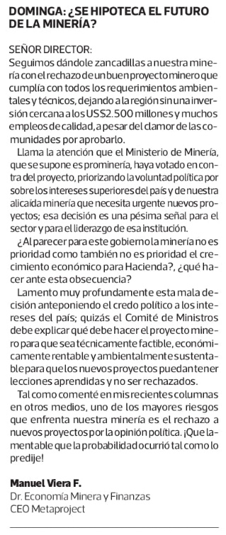 Rechazo de Dominga: mal precedente para el futuro de la minerĂa - (Diario Financiero)