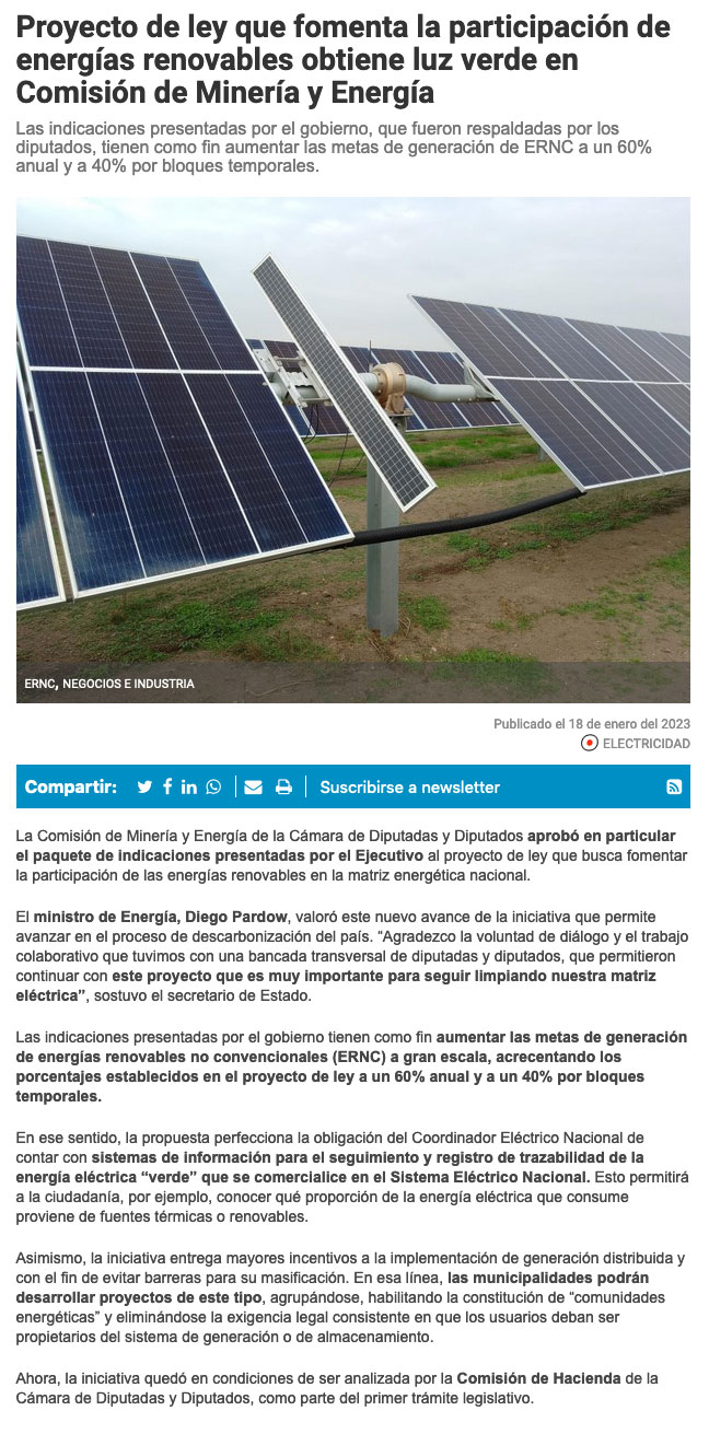 Aprueban proyecto de ley para aumentar la participación de energías renovables en matriz nacional - (soyantofagasta)