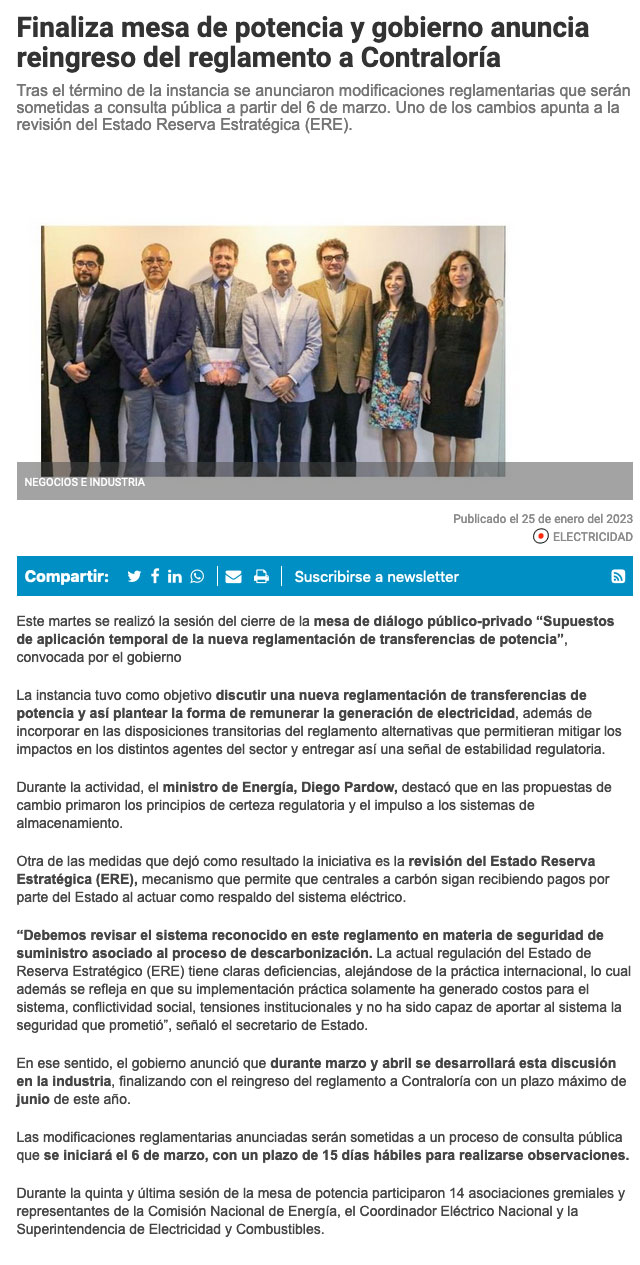 Revisión del ERE: Ministerio de Energía cerró mesa de potencia y reingresará reglamento a Contraloría - (h2news.cl)