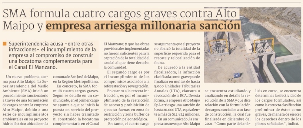 SMA levanta cargos contra Alto Maipo y central arriesga sanciones por más de US$ 18 millones - (El Mercurio de Santiago)
