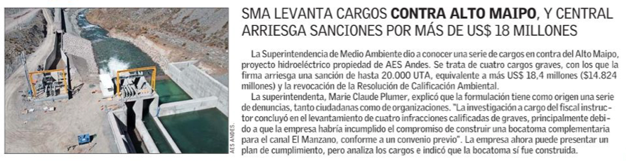 SMA formula cuatro cargos graves contra Alto Maipo y empresa arriesga millonaria sanción - (Diario Financiero)