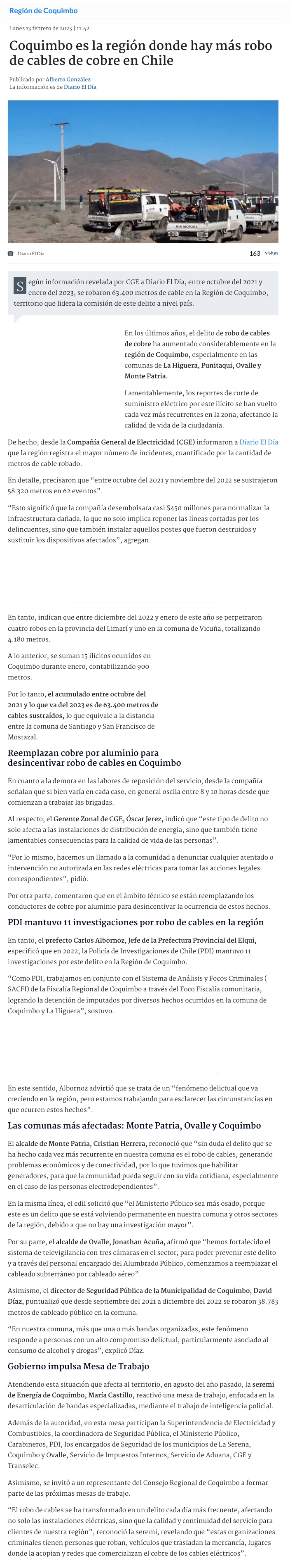 Coquimbo es la región donde más se roban cables de cobre en Chile - (El Día)