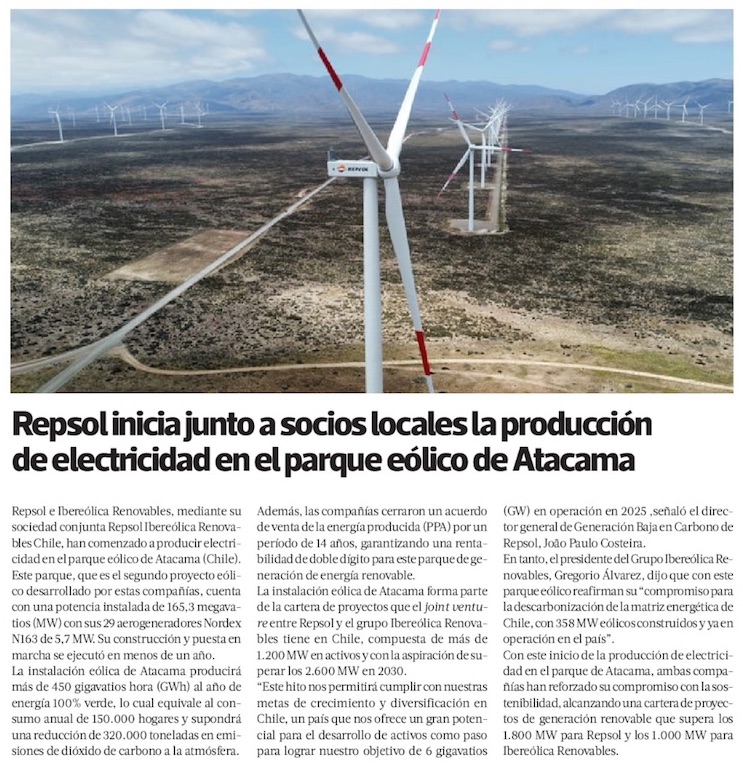 Repsol e Ibereólica Renovables inician la producción eléctrica en su segundo parque eólico conjunto en Chile - (electromineria.cl)