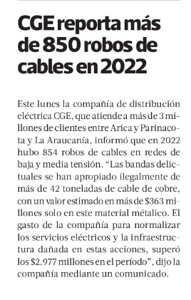 CGE reporta más de 850 robos de cables de cobre en 2022 y el monto sustraído se triplicó - (Diario Financiero)