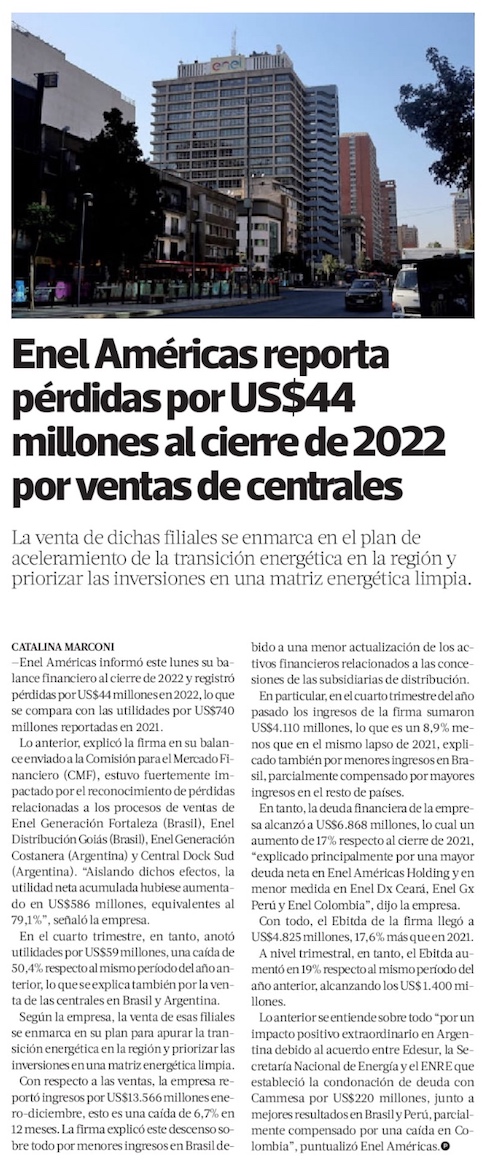 Enel Américas reporta pérdidas por US$ 44 millones en 2022 - (El Mercurio de Santiago)