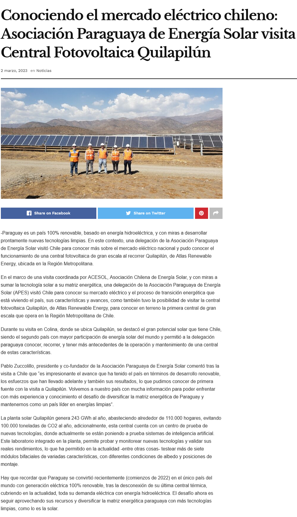 Asociación Paraguaya de Energía Solar visitó central fotovoltaica Quilapilún - (h2news.cl)