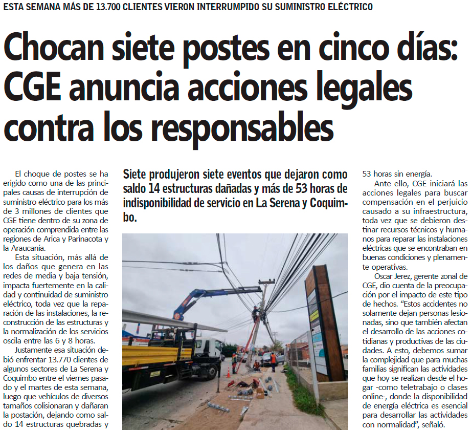 CGE decide querellarse por reiterados choques contra postes de luz - (El Día)
