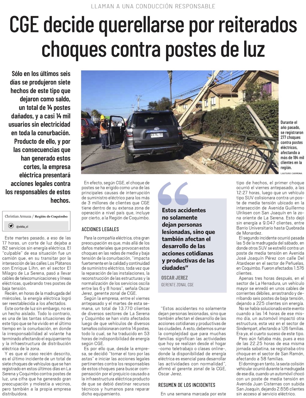 Chocan siete postes en cinco días: CGE anuncia acciones legales contra los responsables - (Semanario Tiempo)