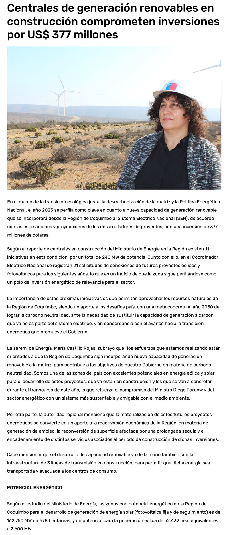 Centrales de generación renovables en construcción comprometen inversiones por US$ 377 millones - (El Día)