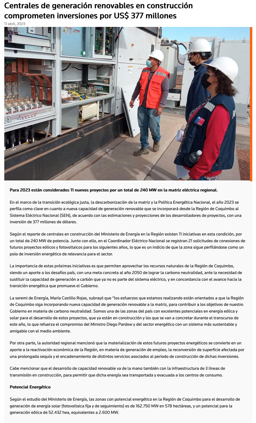 Coquimbo: centrales de generación renovable en construcción comprometen inversiones por US$ 377 millones - (revistaei.cl)