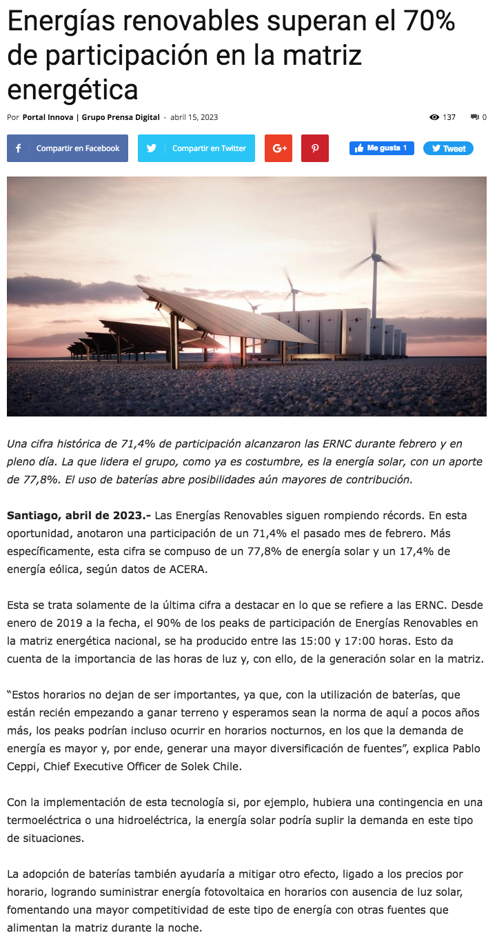 Energías renovables superan el 70% de participación en la matriz energética - (trendtic.cl)