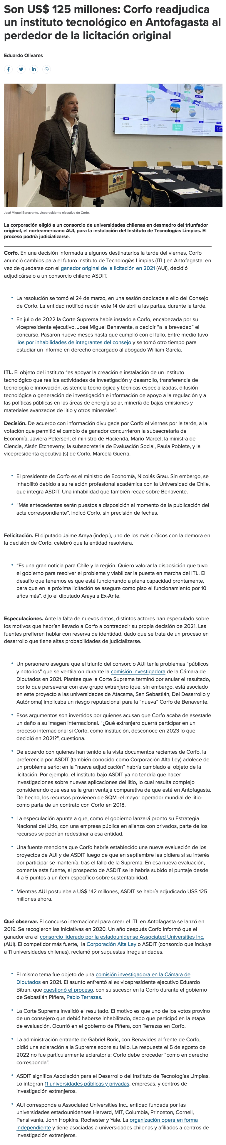 Corfo adjudicó Instituto Chileno de Tecnologías Limpias a Asdit donde participan 11 universidades - (Diario Financiero)
