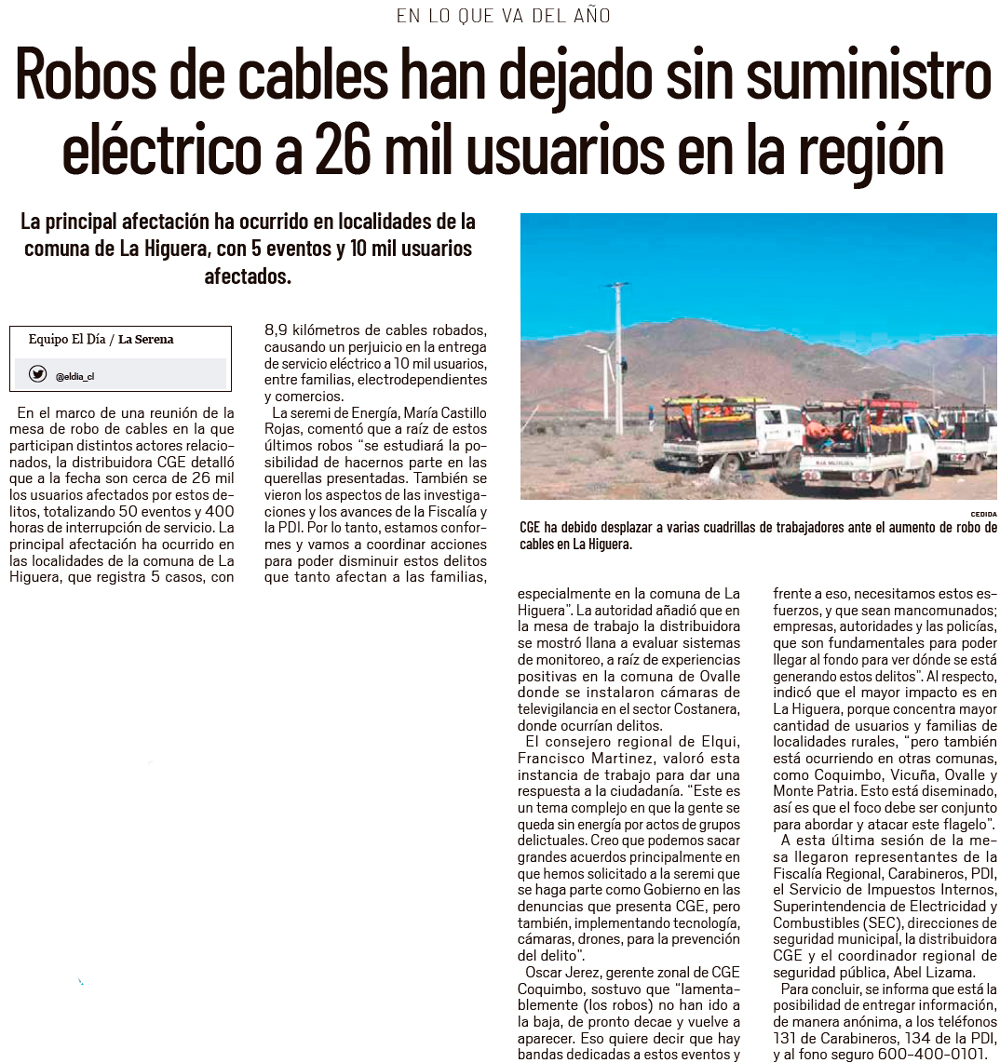 Robo de cables de cobre se extiende a lo largo del país y empresas revelan pérdidas por miles de millones de pesos - (El Mercurio de Santiago)