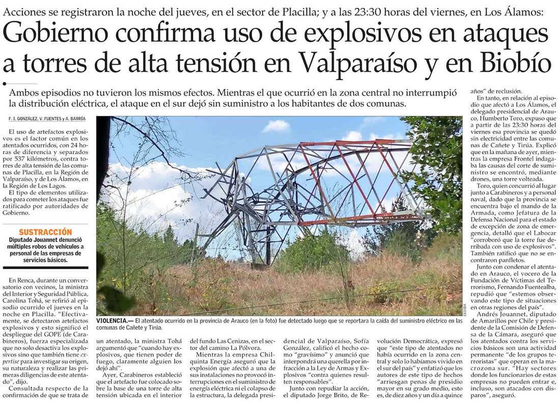 Gobierno confirma uso de explosivos en ataque a torre eléctrica - (Diario Concepción)