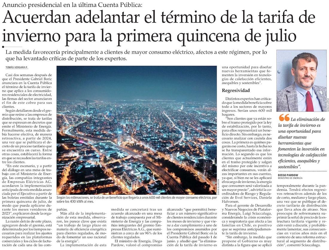 Se adelanta eliminación de tarifa de invierno: se concentrará a partir de la primera quincena de julio - (Diario Financiero)