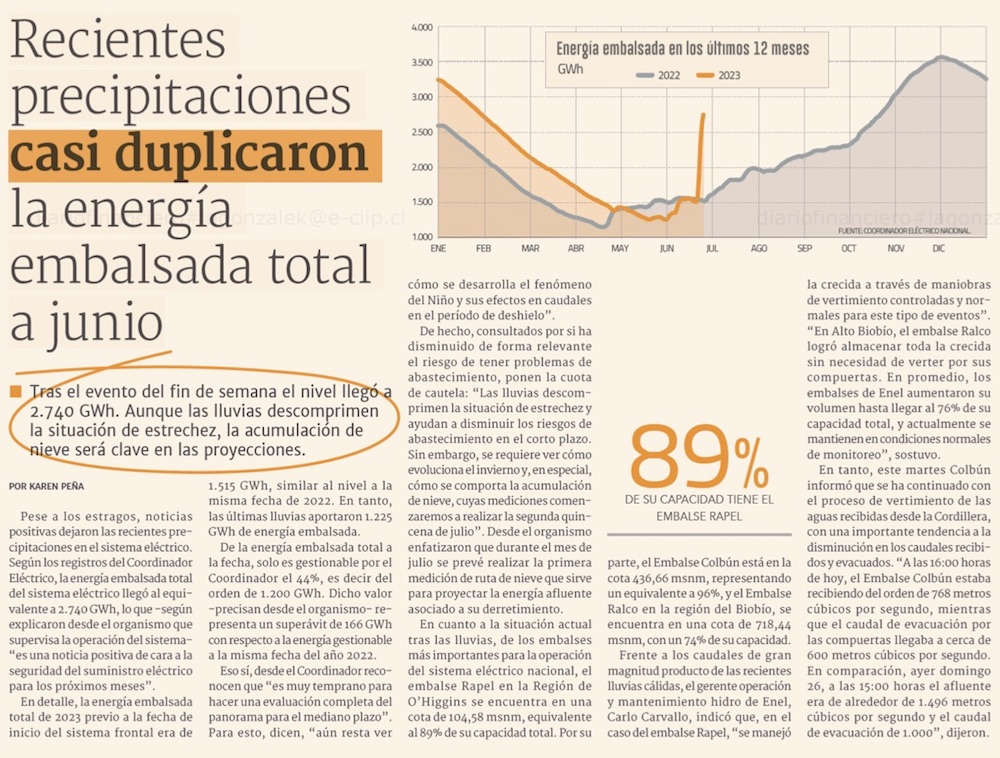 Energía embalsada crece 80% y descomprime el sistema eléctrico - (El Mercurio de Santiago)