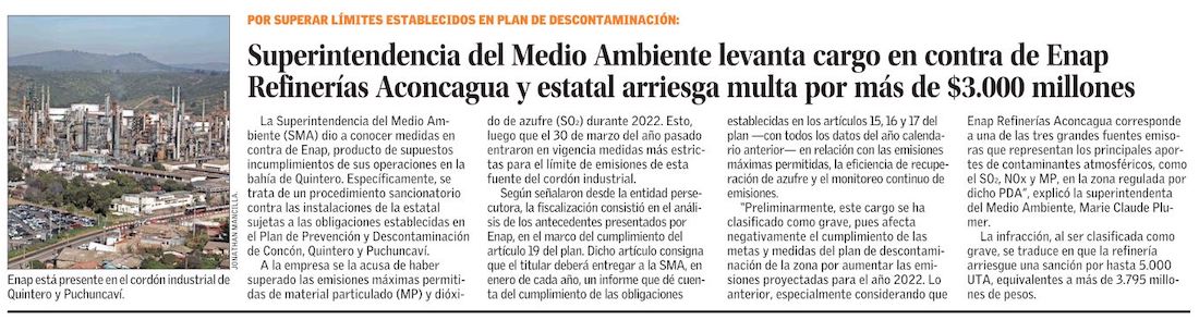 SMA formula cargo grave contra ENAP por superar límite de emisiones del plan de descontaminación de Concón, Quintero y Puchuncaví - (DF Online)