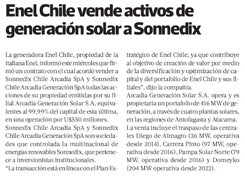 Enel Chile vende activos fotovoltaicos a Sonnedix por US$ 550 millones - (Diario Financiero)
