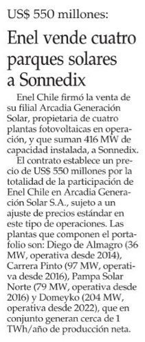 Enel Chile vende activos fotovoltaicos a Sonnedix por US$ 550 millones - (Diario Financiero)