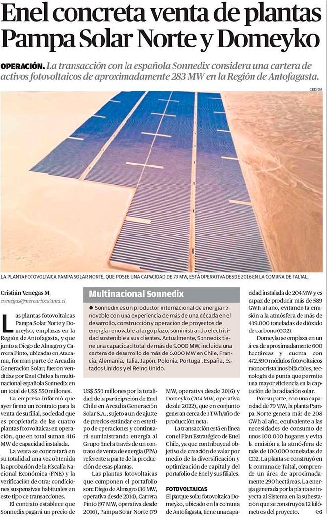 Enel Chile vende activos fotovoltaicos a Sonnedix por US$ 550 millones - (Diario Financiero)