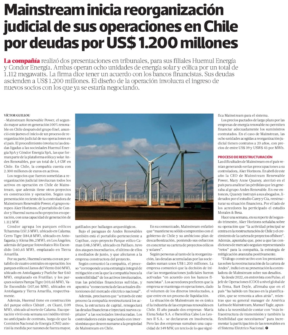 Mainstream inicia reorganización judicial en dos de sus sociedades en Chile y atribuye situación a distorsiones del mercado eléctrico - (El Mercurio de Santiago)