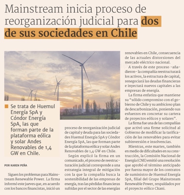 Mainstream inicia reorganización judicial en dos de sus sociedades en Chile y atribuye situación a distorsiones del mercado eléctrico - (El Mercurio de Santiago)