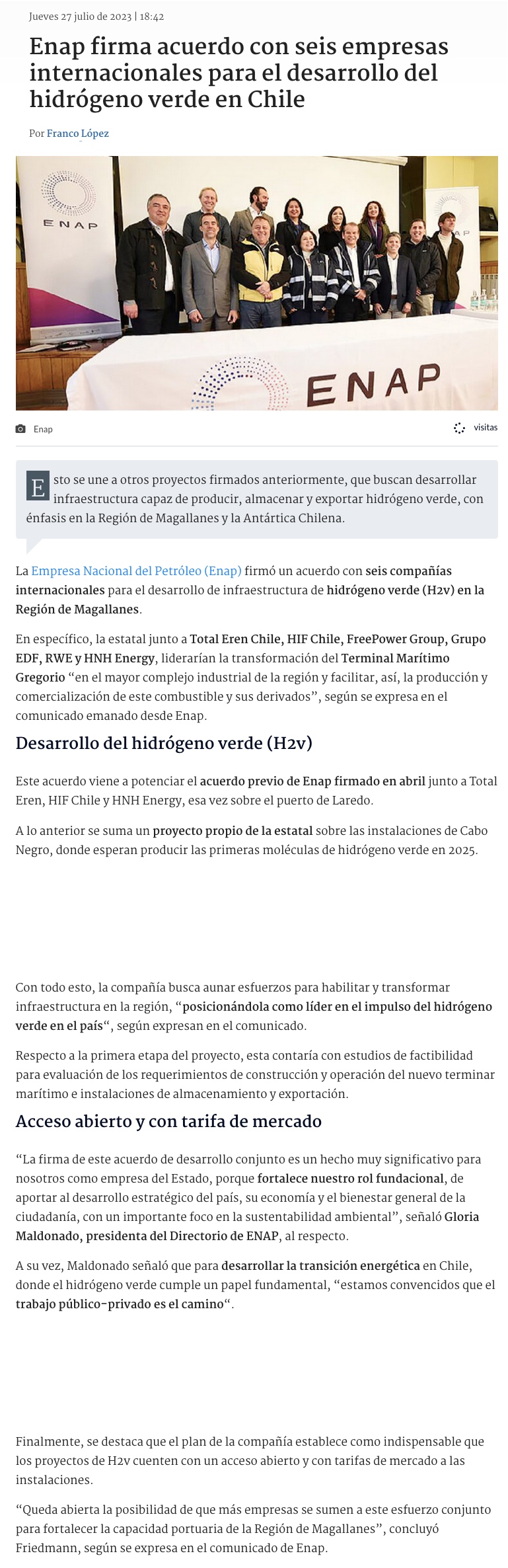 Seis grandes firmas de energía sellan acuerdo para terminal de hidrógeno verde con Enap - (El Mercurio de Santiago)