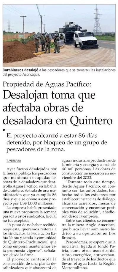 Tras 86 días desalojan a pescadores del proyecto de desaladora de Aguas Pacífico en Puchuncaví - (Diario Financiero)