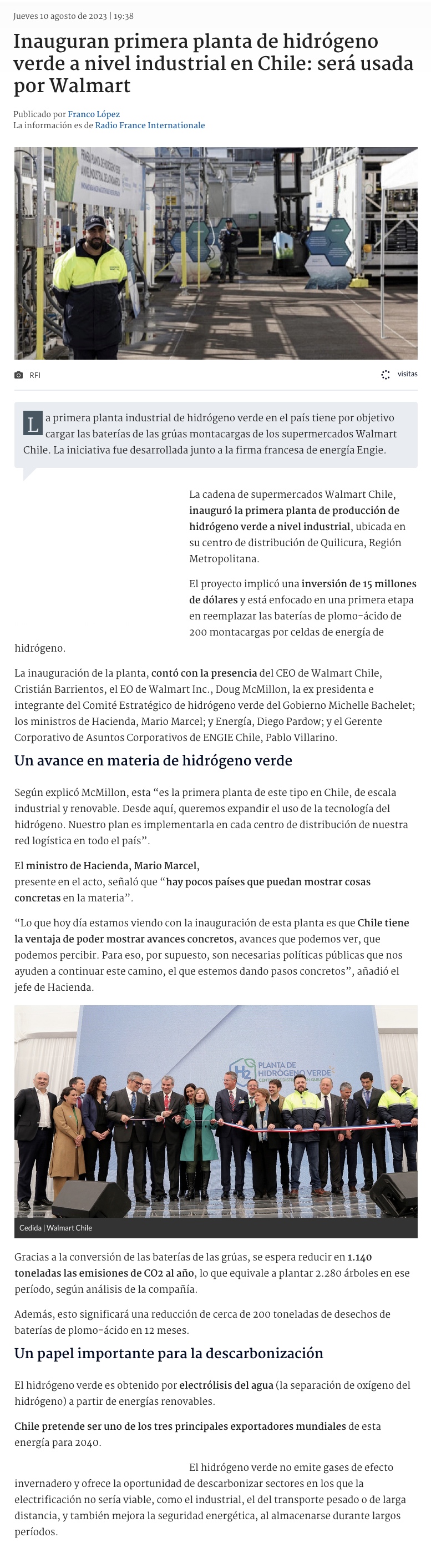 Walmart inaugura la primera planta de hidrĂ³geno verde de uso industrial en Chile - (Pulso)