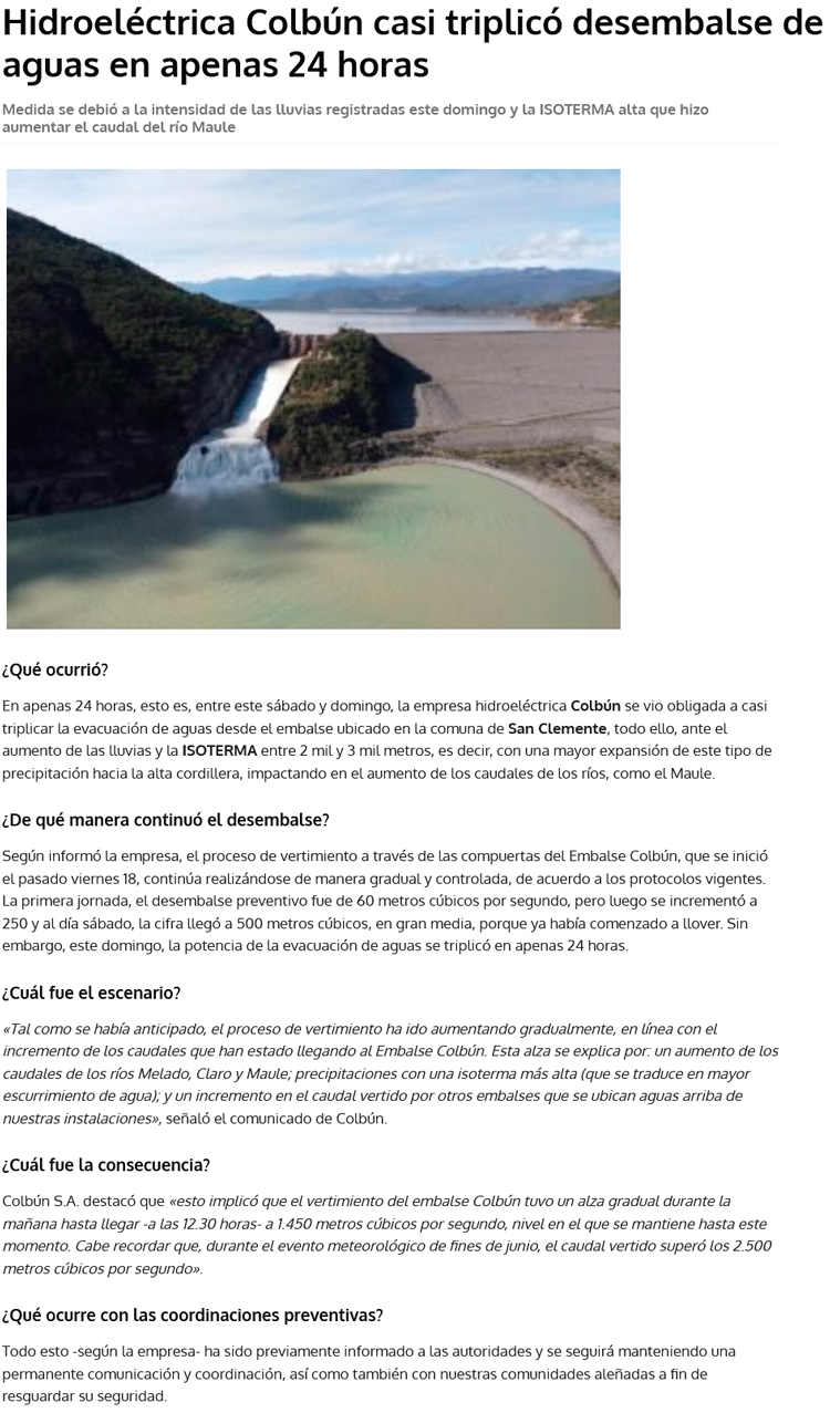 Embalse Colbún está a un metro y medio de alcanzar su cota máxima - (Las Últimas Noticias)