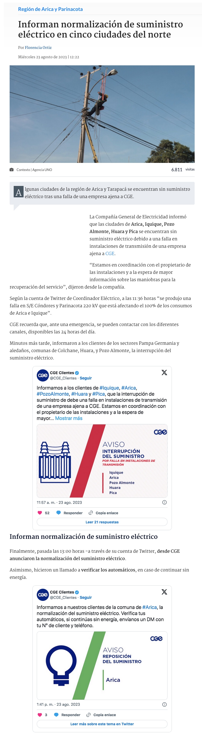 Corte de energía afectó a las regiones de Arica y Tarapacá: Empresa señaló que fue por situaciones ajenas - (cooperativa online)