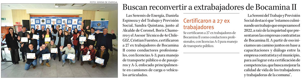 Reconversión laboral de extrabajadores de Bocamina 2: Transporte público, camiones de carga o vehículos articulados - (reportesostenible.cl)