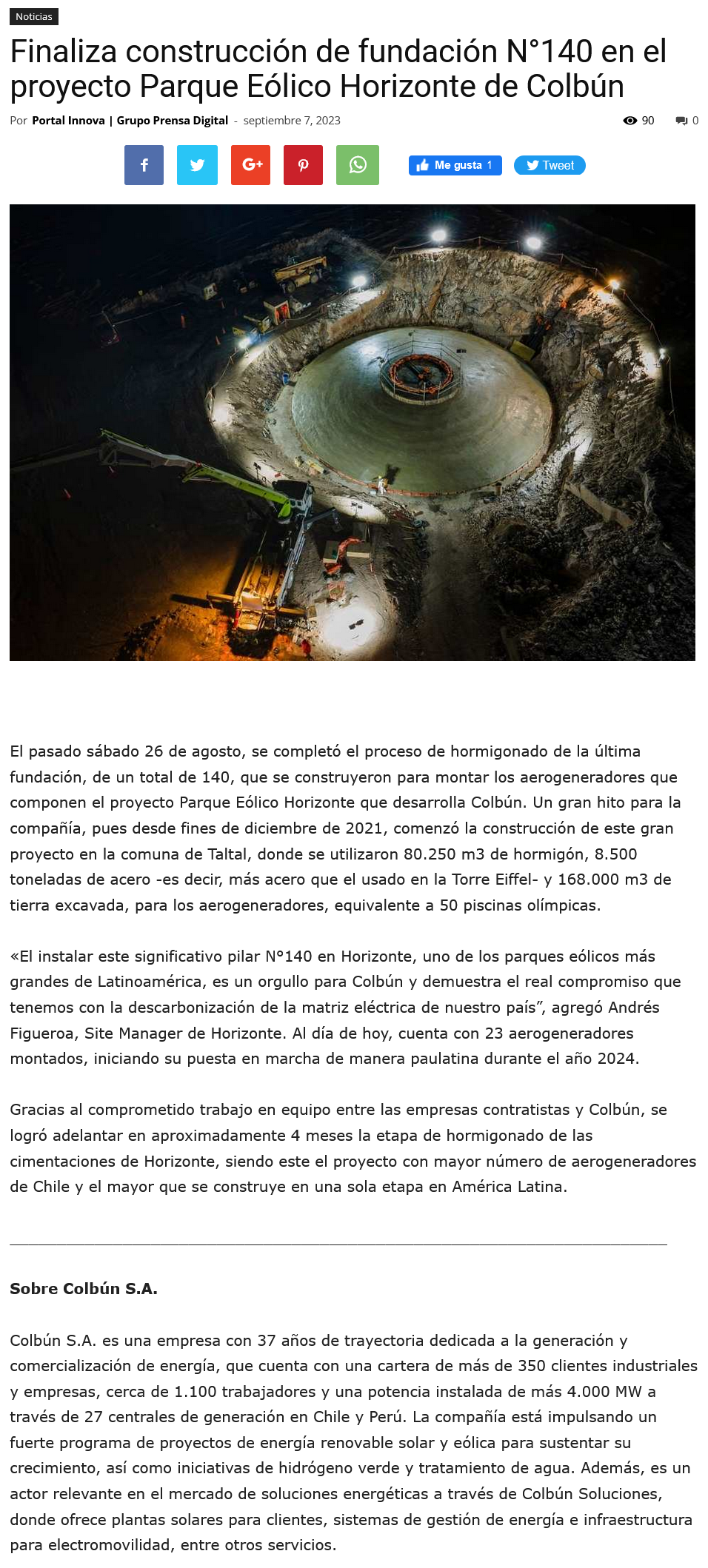 Parque Eólico Horizonte finaliza la construcción de sus 140 fundaciones - (El Mercurio de Antofagasta)