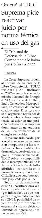 Conflicto por gas inflexible: Suprema ordena al TDLC reanudar juicio contra la CNE por eventuales infracciones a la libre competencia - (Diario Financiero)