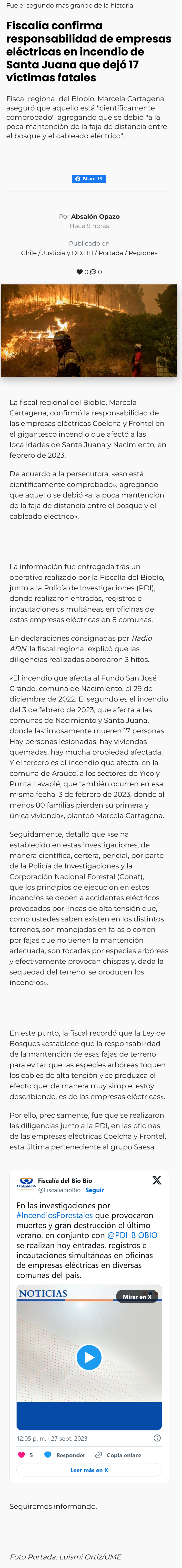 Fiscalía: Empresas eléctricas fueron responsables de mortales incendios en el Biobío - (cooperativa online)