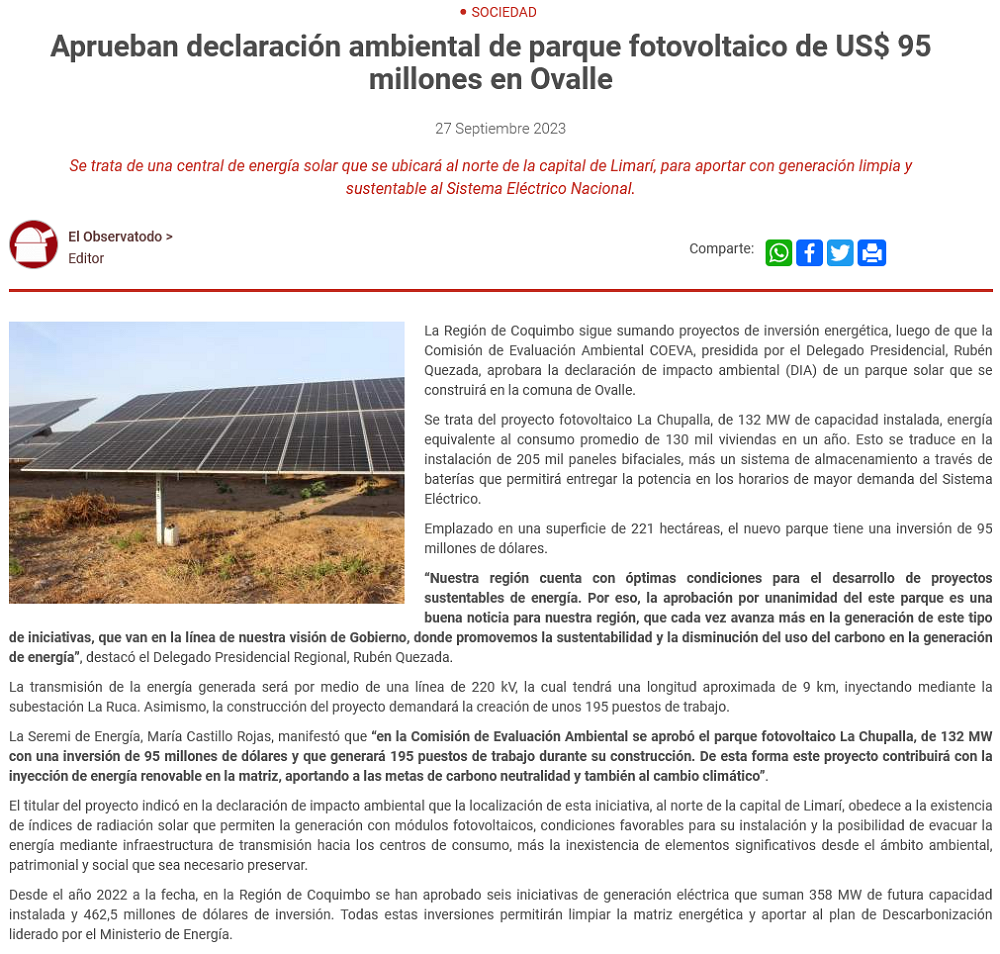 Aprueban declaración ambiental de parque fotovoltaico de US$ 95 millones en Ovalle - (La Región)