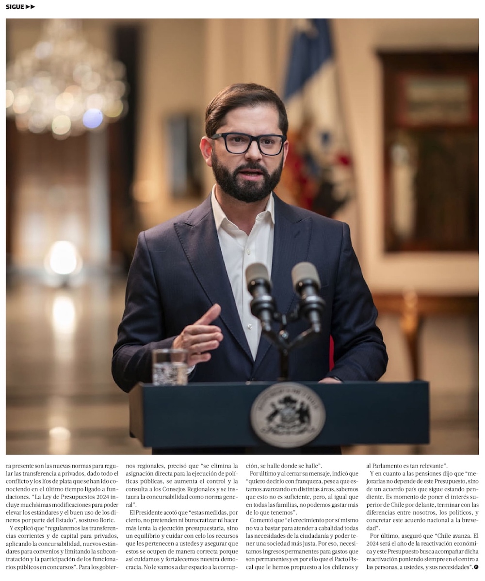 Boric anuncia que Presupuesto 2024 aumentará en 3,5% con focos en seguridad y probidad - (El Mercurio de Santiago)