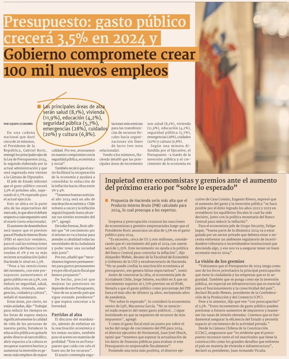 Presupuesto 2024: Boric anuncia un mayor gasto fiscal de 3,5%, enfocado en seguridad, reactivación y probidad - (El Mercurio de Santiago)
